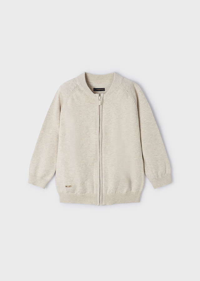 - Kardigan z gładkiej dzianiny dla chłopca z kolekcji wiosna - lato Mayoral Mini, dekolt okrągły, zasuwany na zamek, kolor rafia.