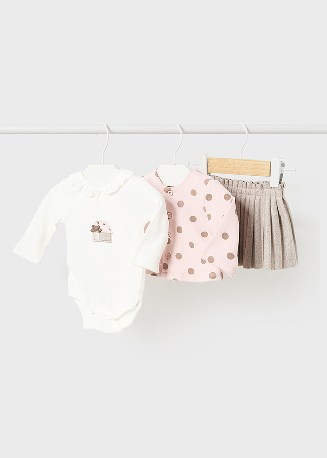 - Komplet 3-częściowy dla dziewczynki z kolekcji jesień - zima Mayoral Newborn, body, spódniczka, bluza; kolor rosa baby.